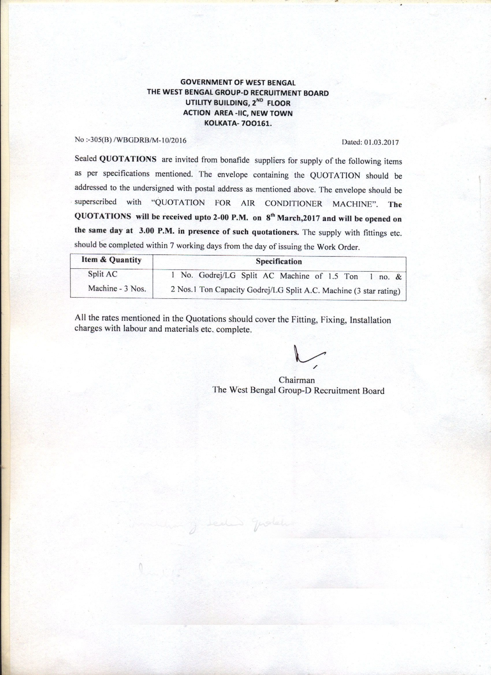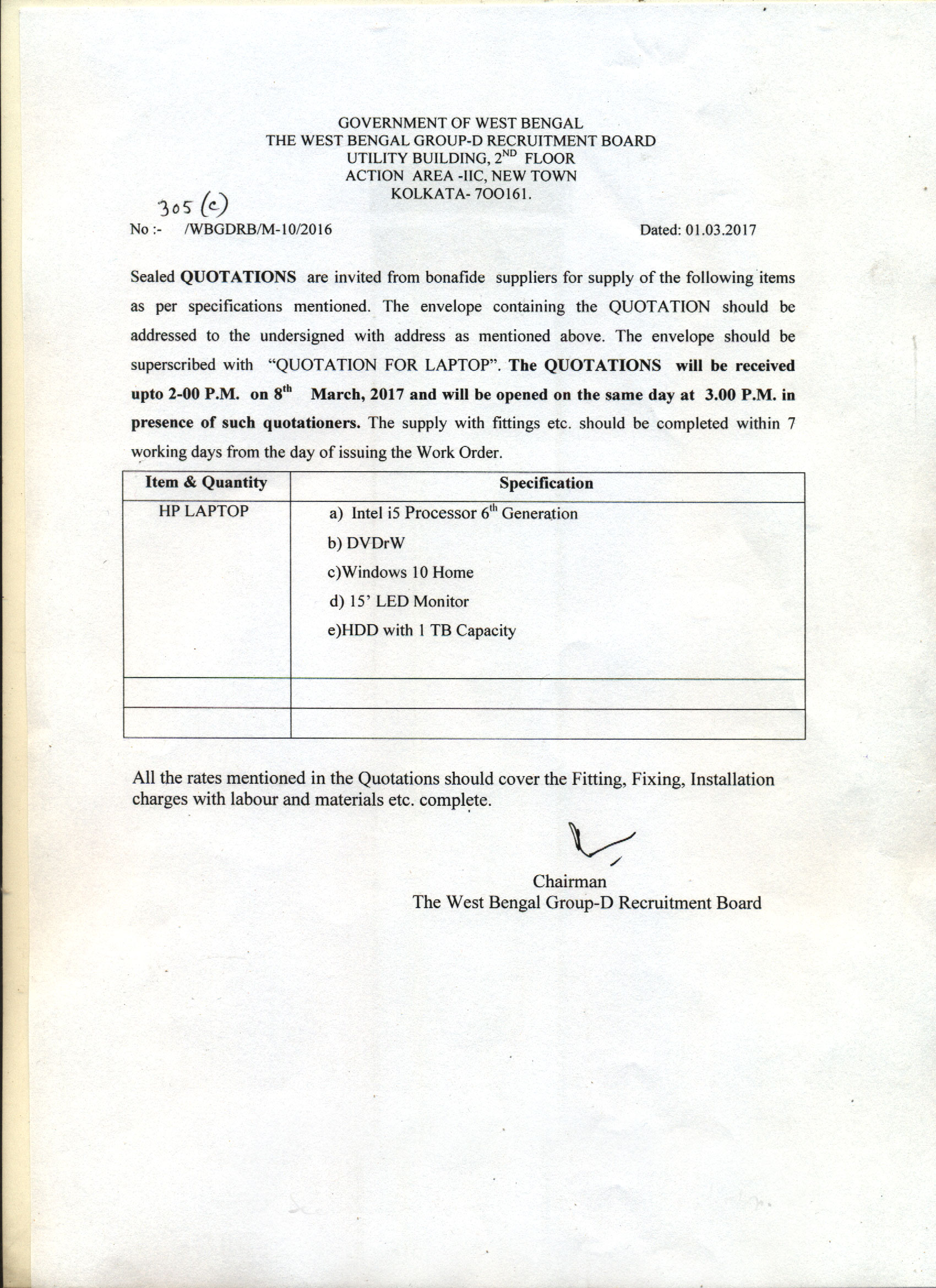 Ref:- Tender notice no. WBGDRB/Tender/01/2016