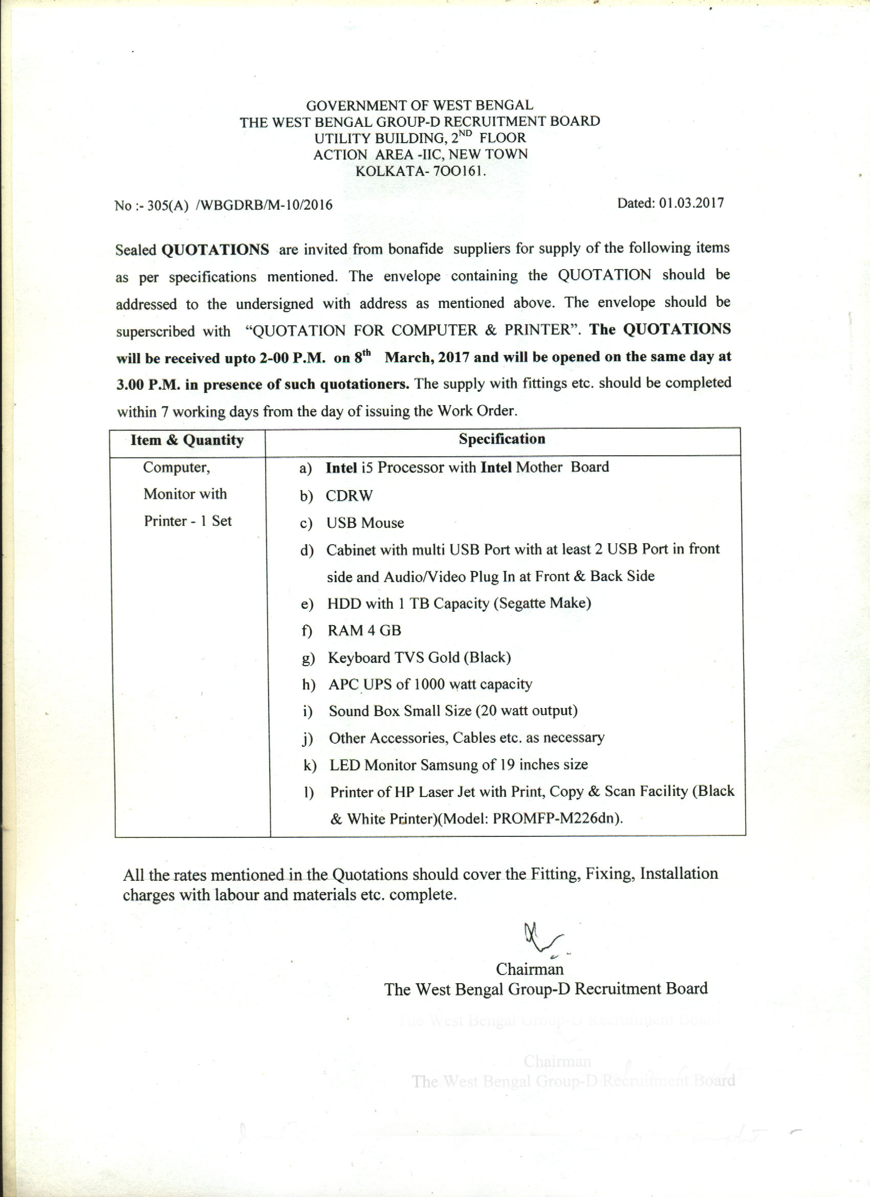 West Bengal Group D Recruitment Board invites Expression of Interest (EOI) from reputed and bonafide organizations/ Institutes/ Public/ Private limited company or Firm, for assisting the Board in the matter of recruitment of Group D personnel in the various offices of the Government of West Bengal. Details will be available under the Menu bar ?Tender? in the website of The Board. Last date of submission of EOI is up to 5 PM on 6th April 2016.